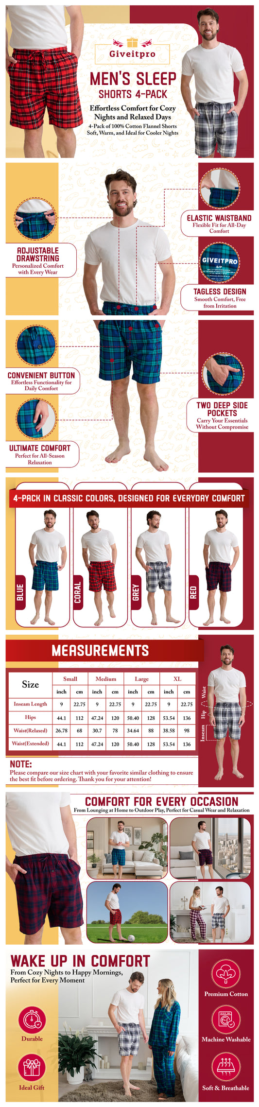 GIVEITPRO Lot de 4 pyjamas à braguette boutonnée en flanelle 100 % coton de qualité supérieure - Tissé teint en fil