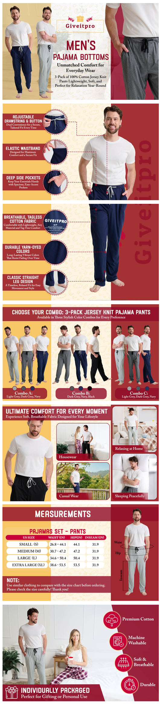 Lot de 3 bas de pyjama en jersey 100 % coton de qualité supérieure GIVEITPRO - Teinture en fil